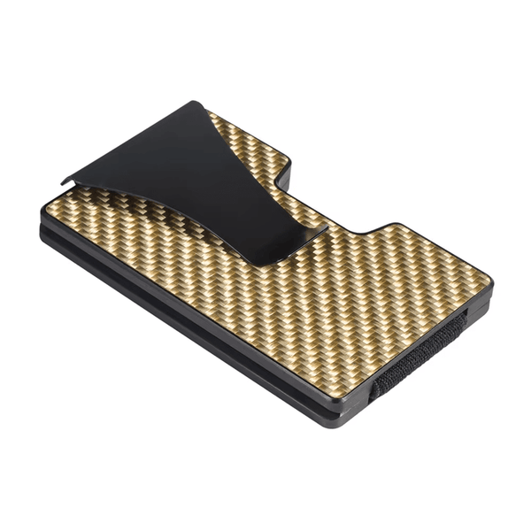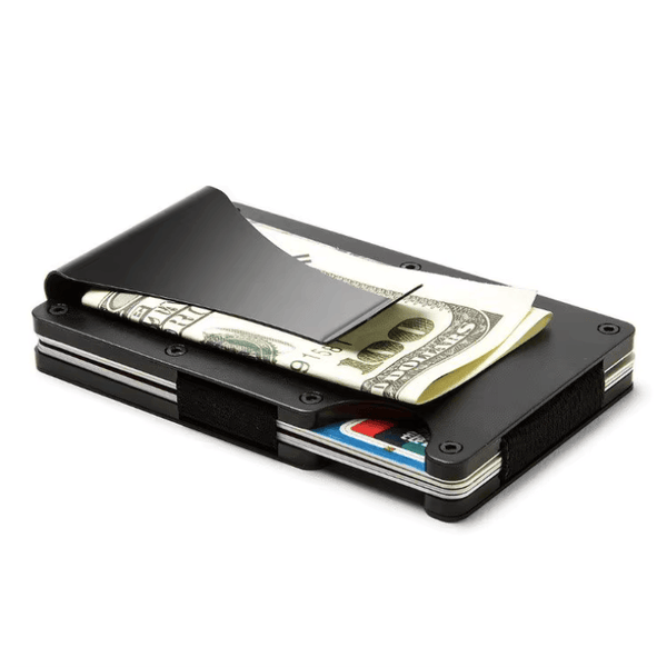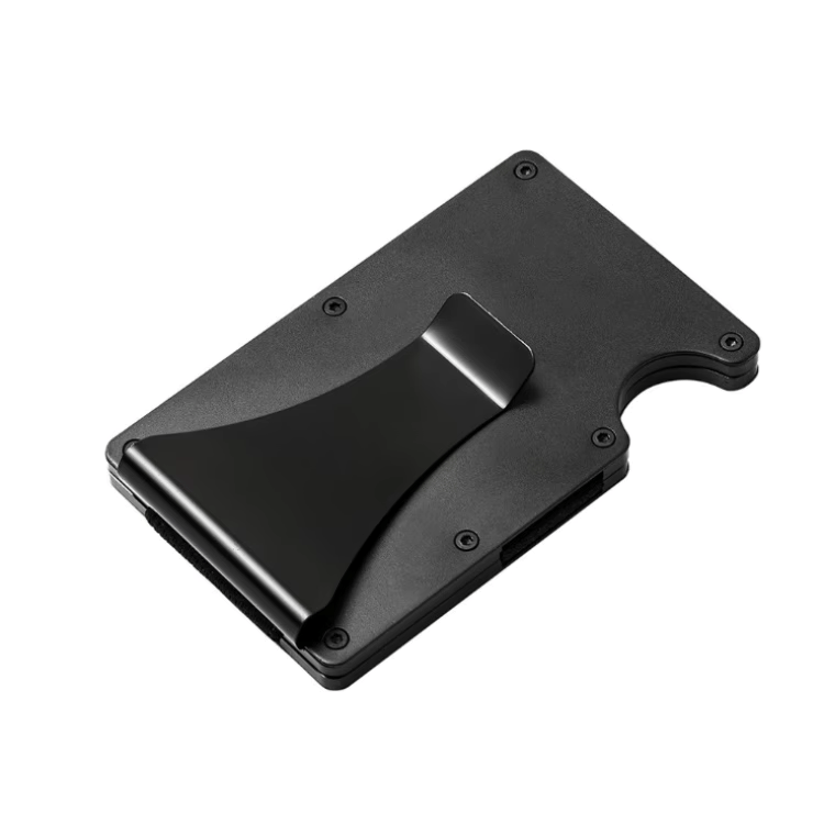 Minimalistična aluminijasta denarnica karbonskih vlaken in z črno kovinsko sponko za denar.